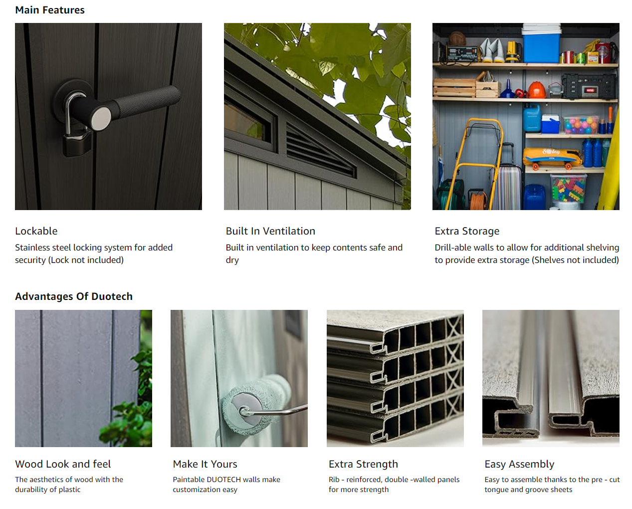 • Made of durable maintenance and fade-free resin with rib reinforced and steel reinforcement wall panels