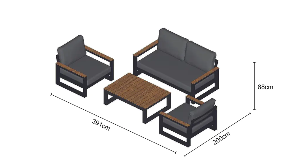 A brilliant, vibrant lounge set. The Milan outdoor lounge set is a stylish way to enjoy your garden all year round. With it’s exceptional weatherproof construction. This lounge set is perfect for use all year round. The base is made of treated aluminum for a superb, strong finish and the cushions are upholstered with modern fabric that can withstand a rain shower (Though a cushion bag is recommended). Featuring a comfortable sofa and a superb armchair. This garden sofa set also comes with superb teak topped table with an aluminum base that’s easy to clean and maintain. You can mix and match any parts to make the outdoor sofa set of your dreams.