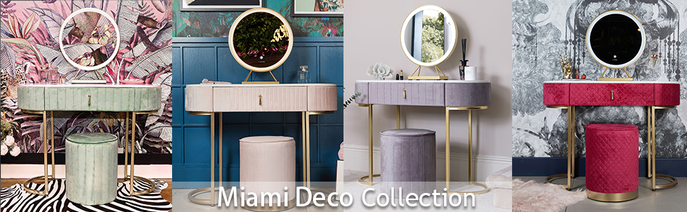 • The Miami Deco dressing table comes with a matching round padded velvet stool for the ultimate comfort. Available in Sage Green and Dove Grey.